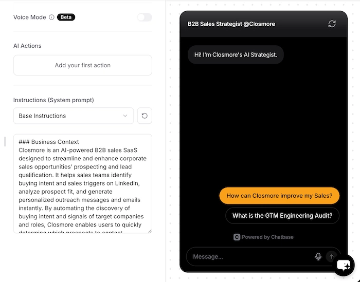 Make your best consultant live on your website. Closmore trained a 'Sales Consultant' with win/loss patterns, qualification frameworks, etc., using Chatbase. Try it on the button right corner.