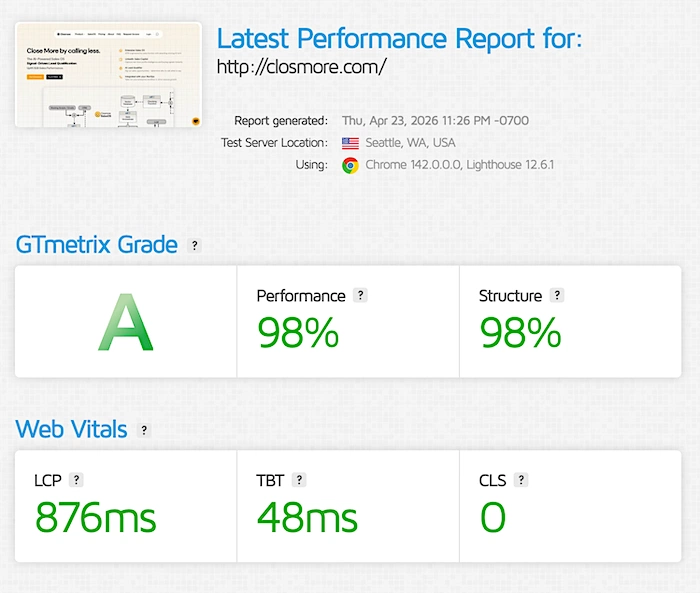A slow webpage kills both your SEO ranking and prospects' impressions. Poor technical performance is fatal. Run it monthly, not once at launch.