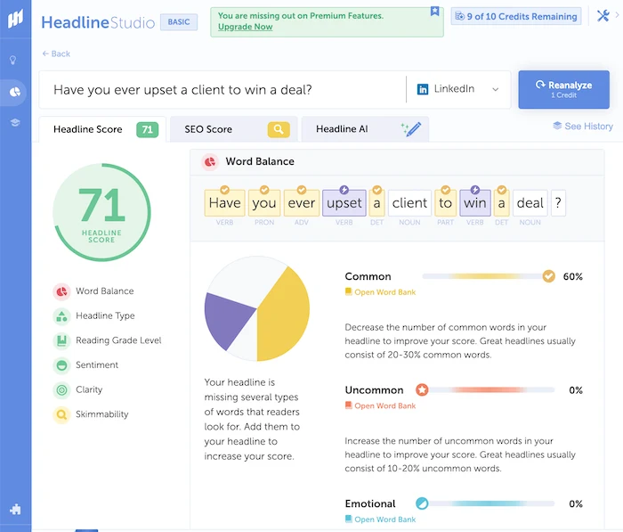 CoSchedule's Headline Analyser scores your headlines for emotional impact, clarity, and SEO, helping you write titles that get clicked.