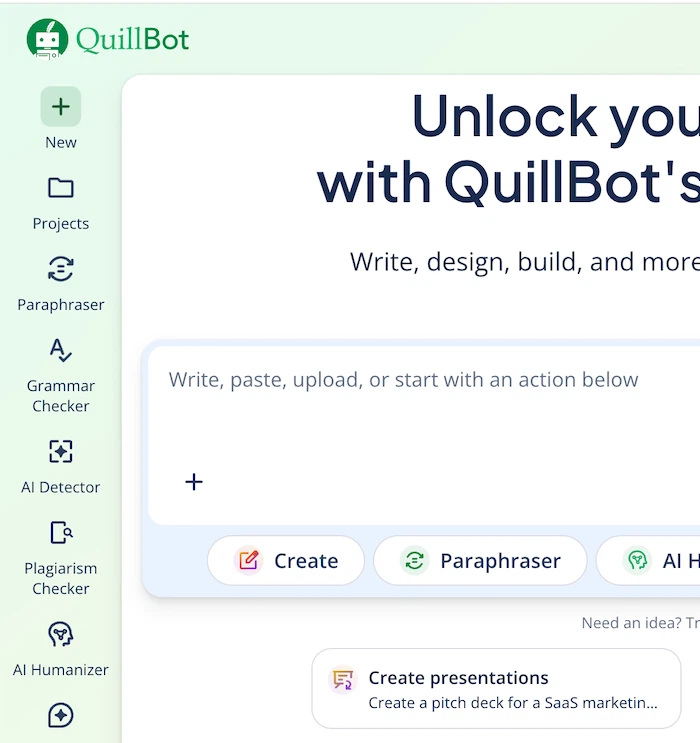 QuillBot is an AI writing assistant that paraphrases, summarizes, and refines text, helping rewrite content with different tones, styles, and formality.