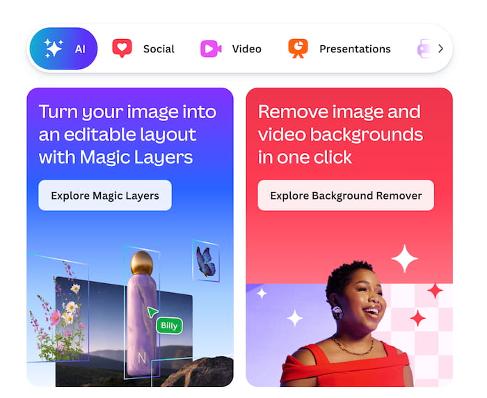 Canva's Magic Studio suite lets you create and edit presentations, social content, and marketing materials with AI-powered tools including Magic Layers and brand kit management.