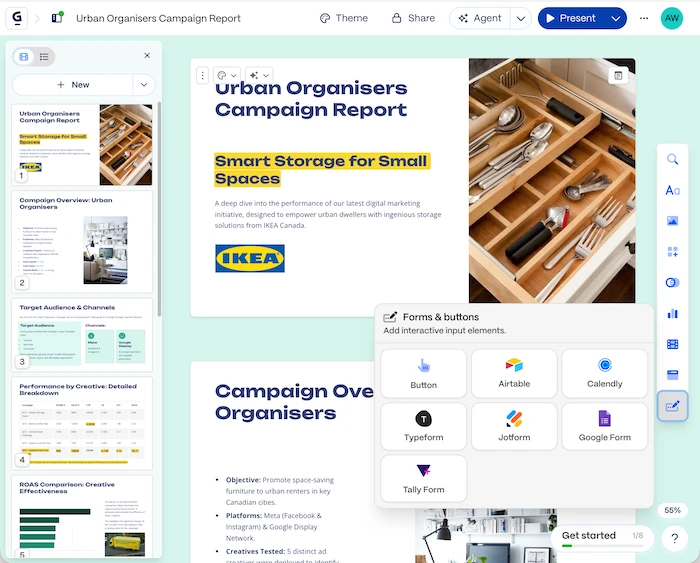 Gamma is an AI presentation/document builder that creates interactive decks from a prompt in minutes, no design skills required.