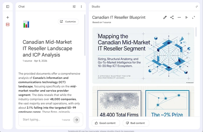 Run Deep Research output through NotebookLM to generate a podcast-style briefing before a major account meeting. A short audio summary keeps high-performers stay sharp.