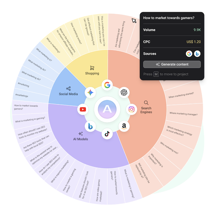 Answer the Public visualizes questions, comparisons, and phrases people search around a keyword, giving direct insight into your buyer's mindset.