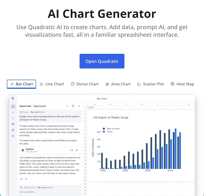 Quadratic is an AI-powered spreadsheet that lets you query, analyze, and visualize data using natural language, no complex formulas required.